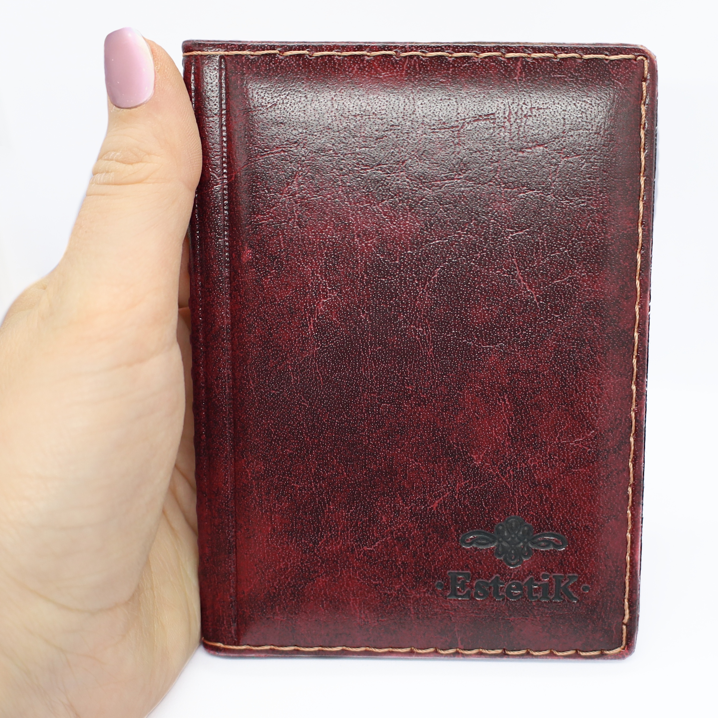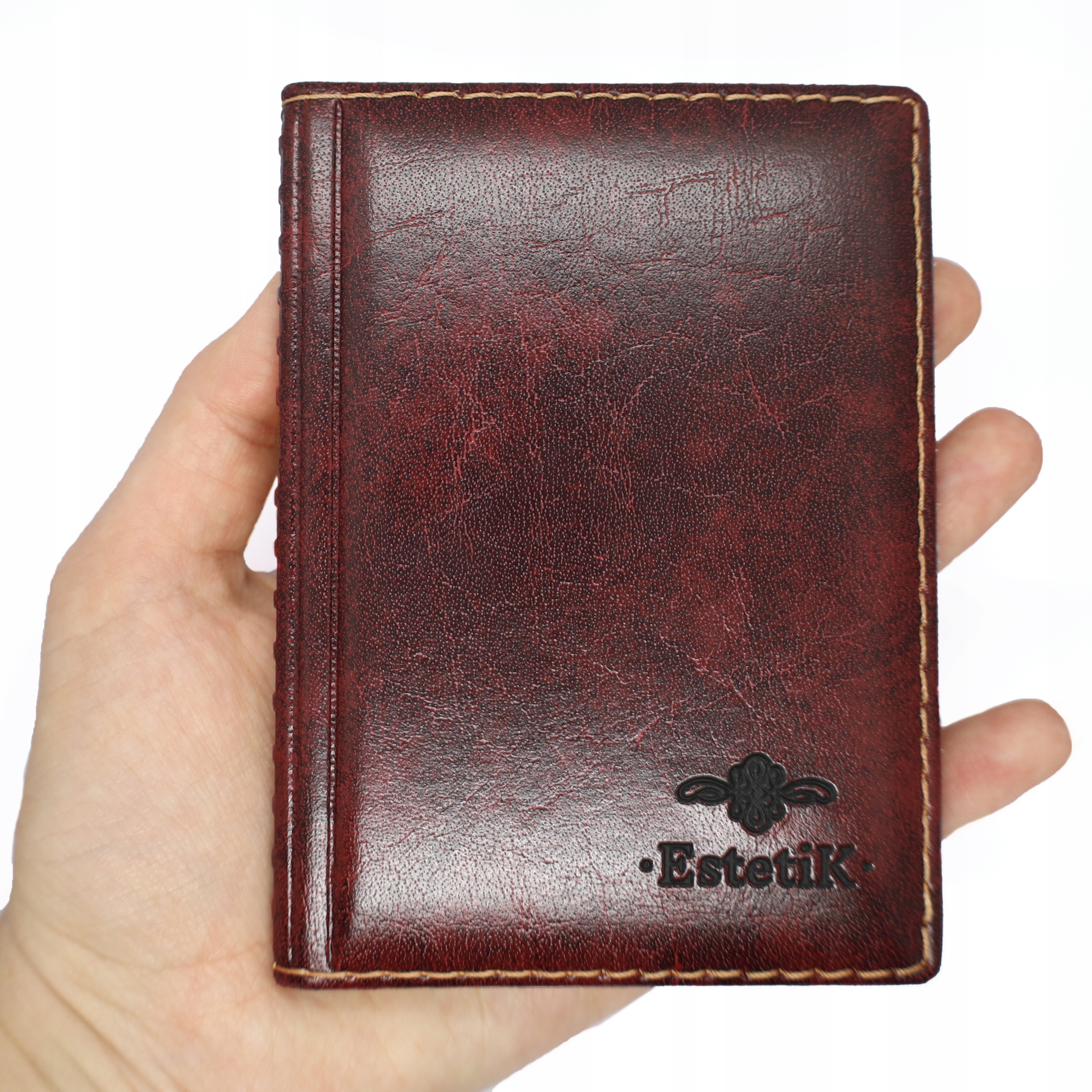 Piękne, wysokiej jakości bordowe etui, bardzo kompaktowe i ergonomiczne z tłoczonym logo EstetiK.