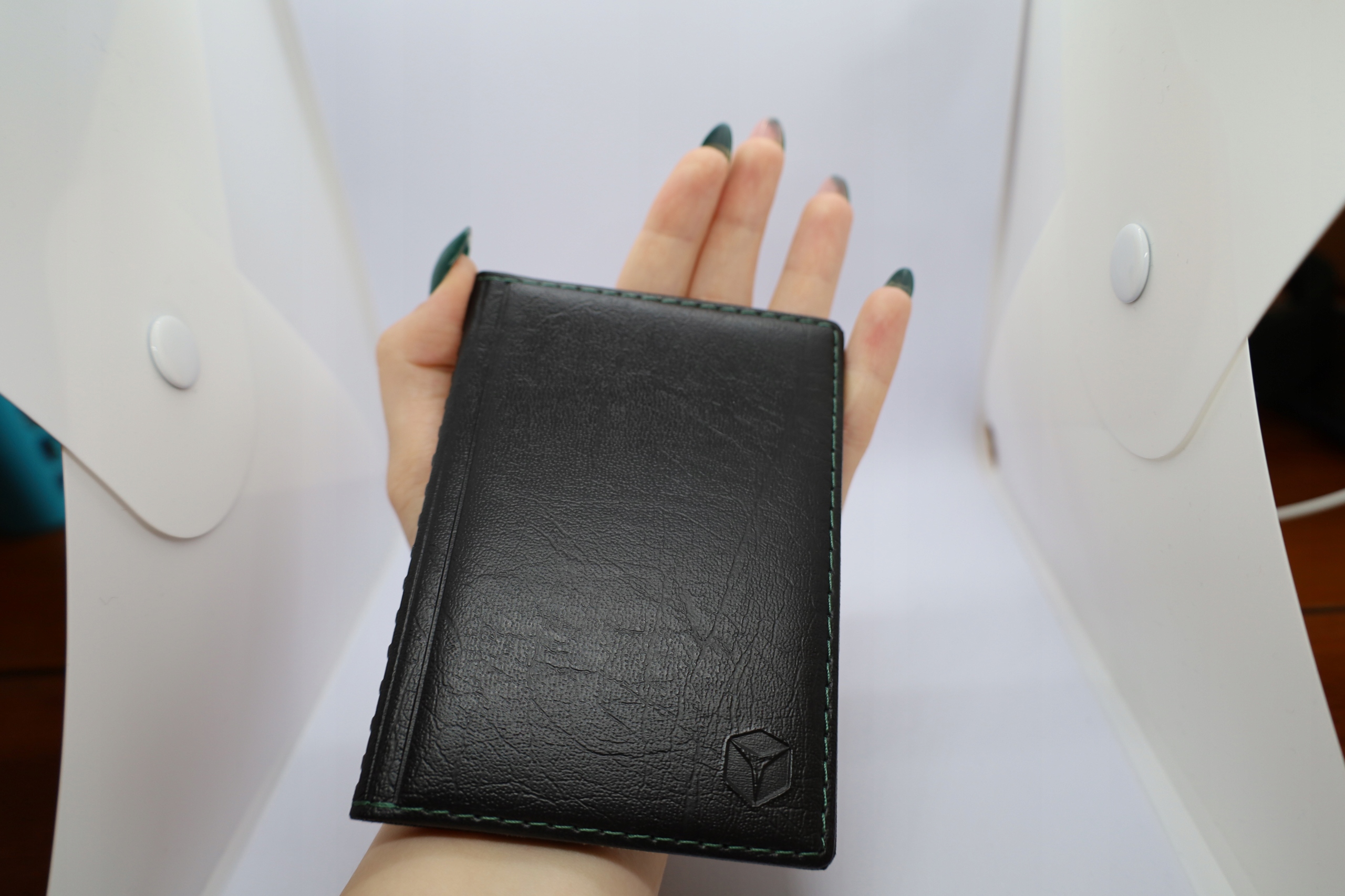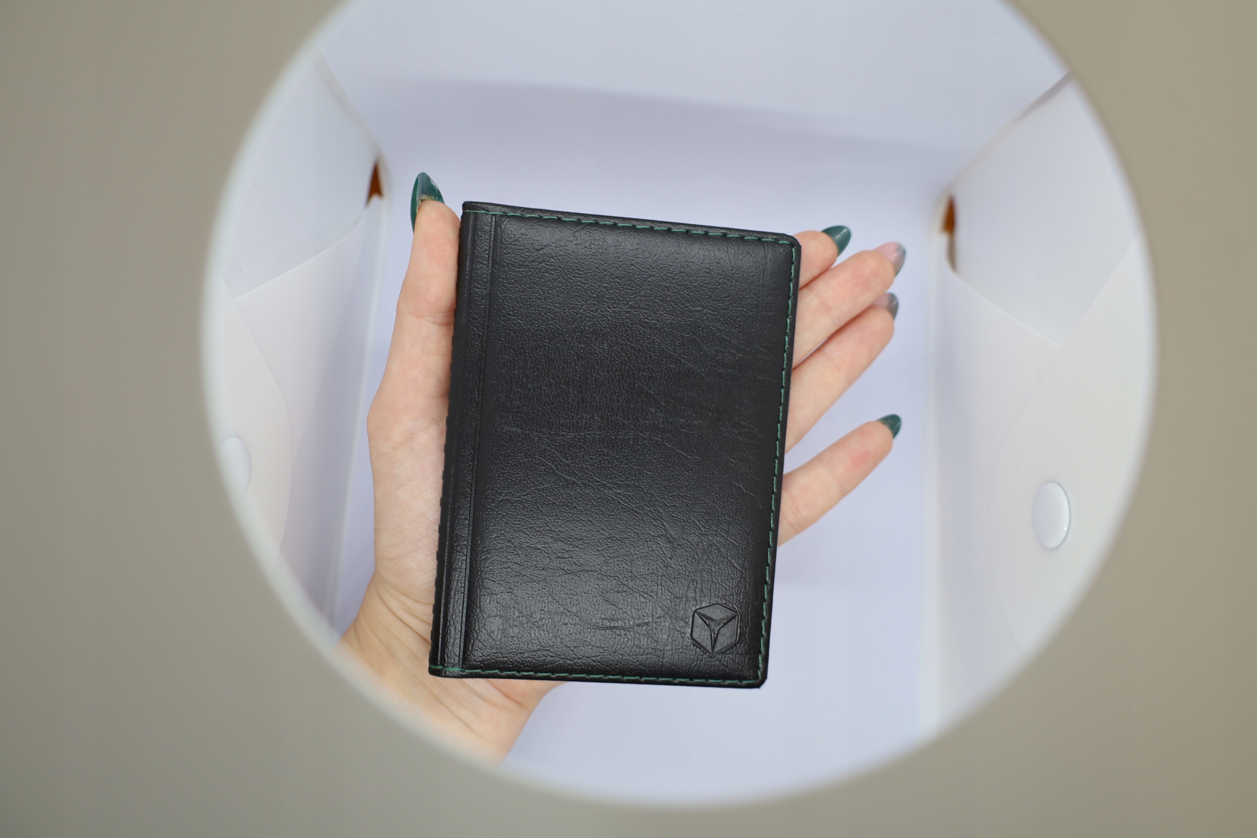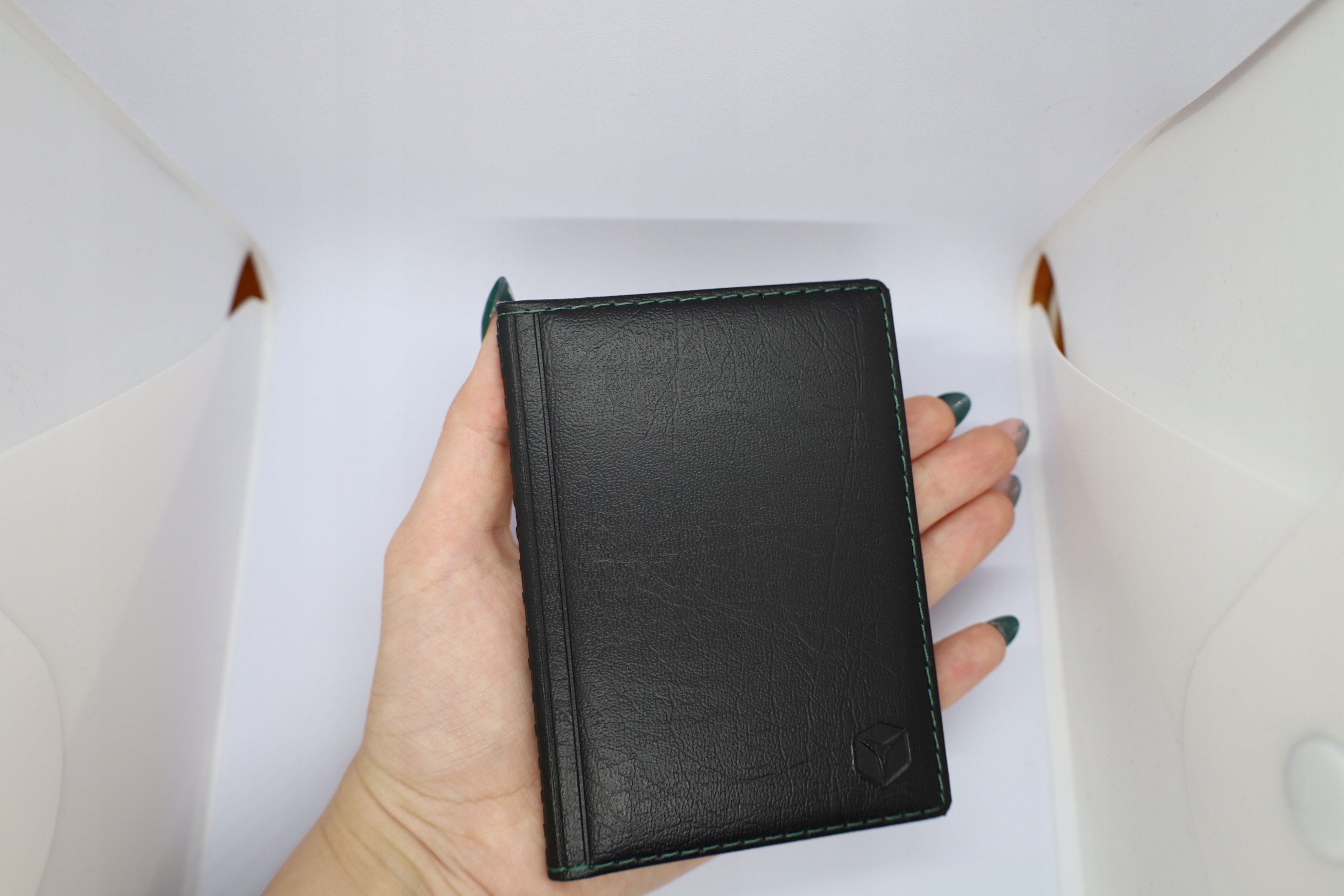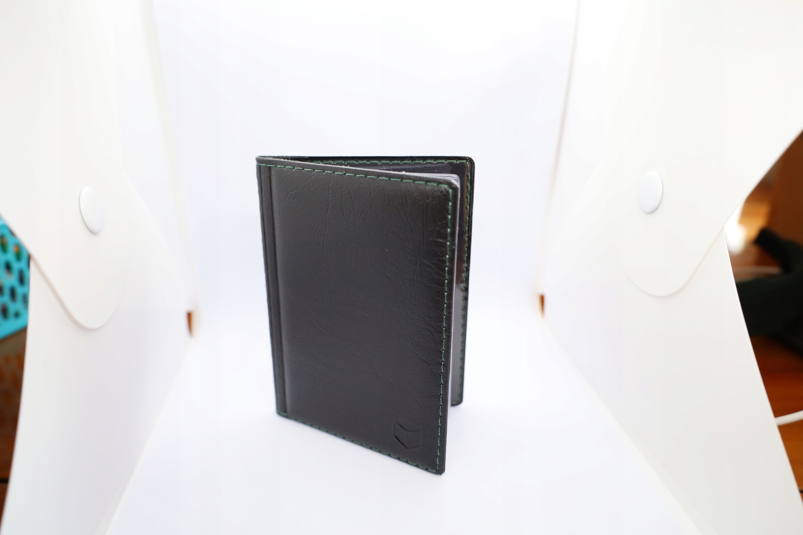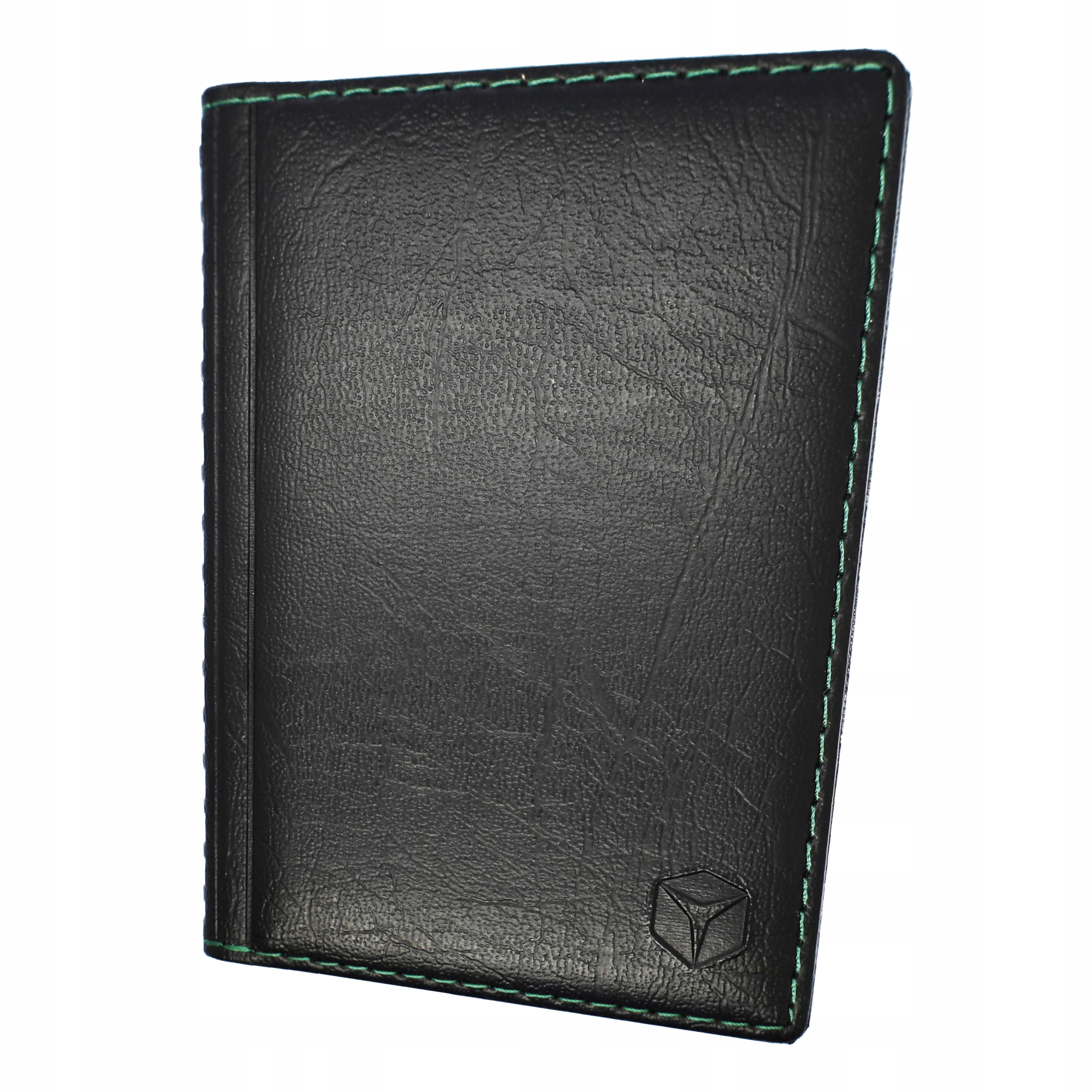 Oprawka na dokumenty z najwyższej jakości skóry ekologicznej w kolorze czarnym, obszyta zieloną nicią.