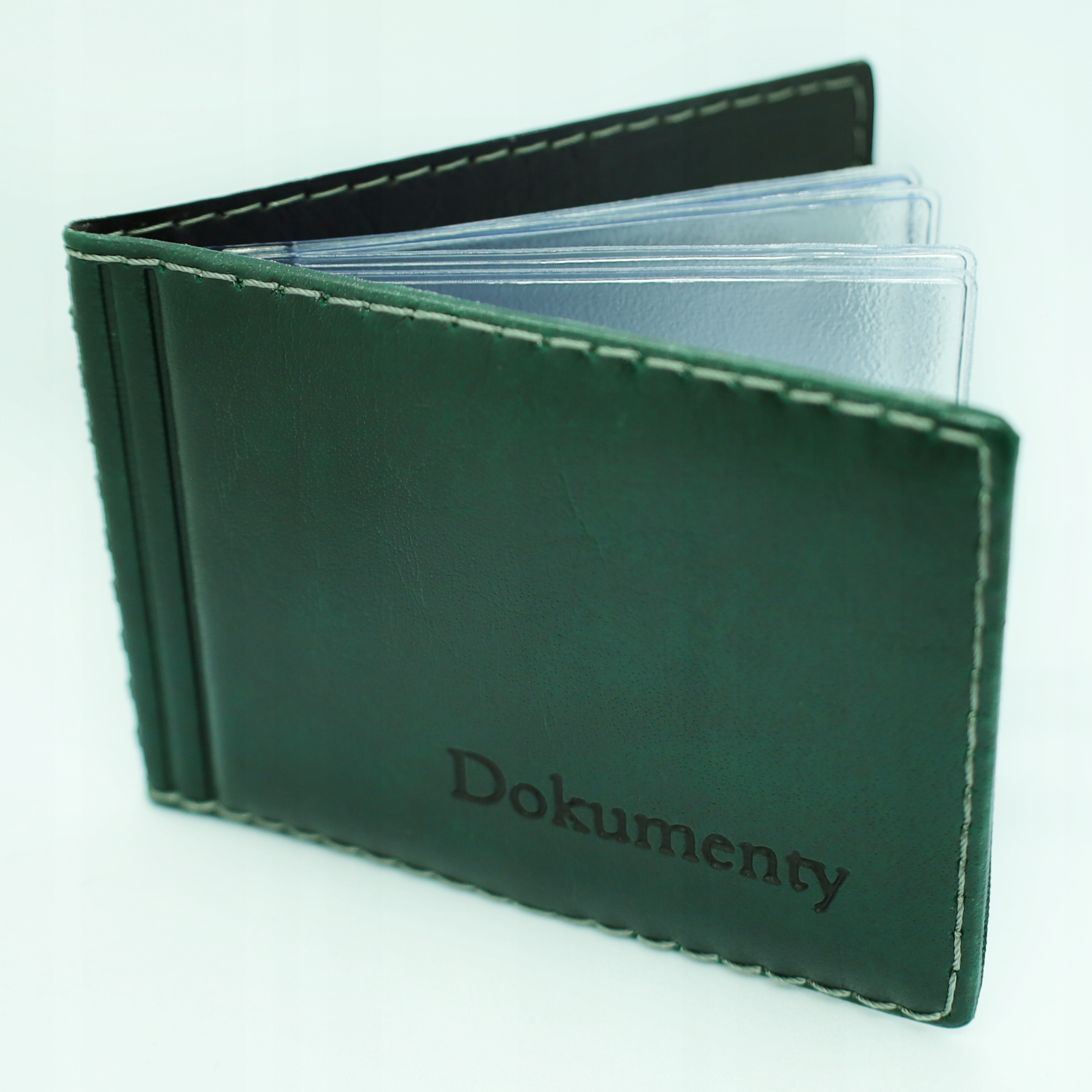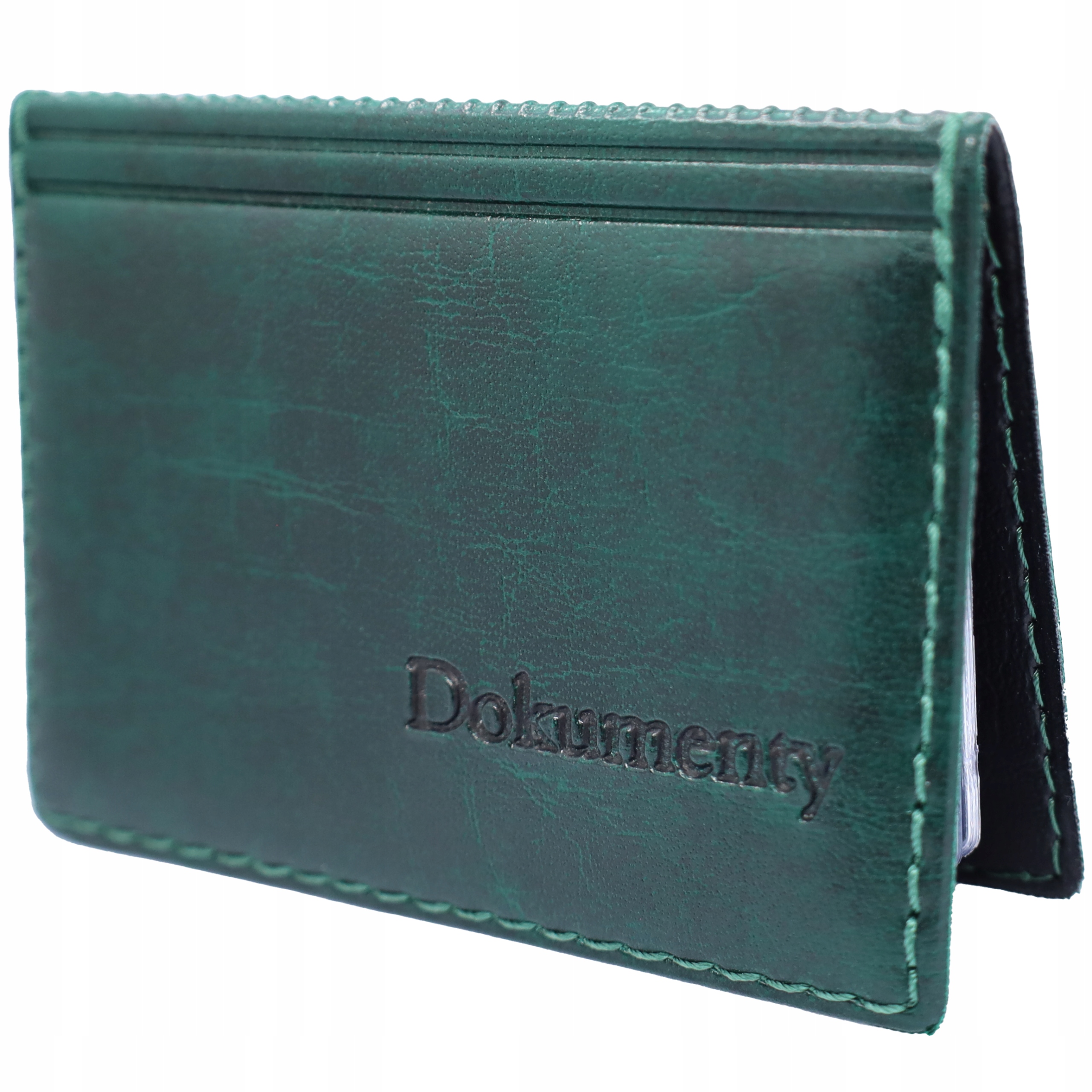 Oprawka na dokumenty z najwyższej jakości skóry ekologicznej w kolorze zielonym z elegancko tłoczonym napisem „Dokumenty”, obszyta.