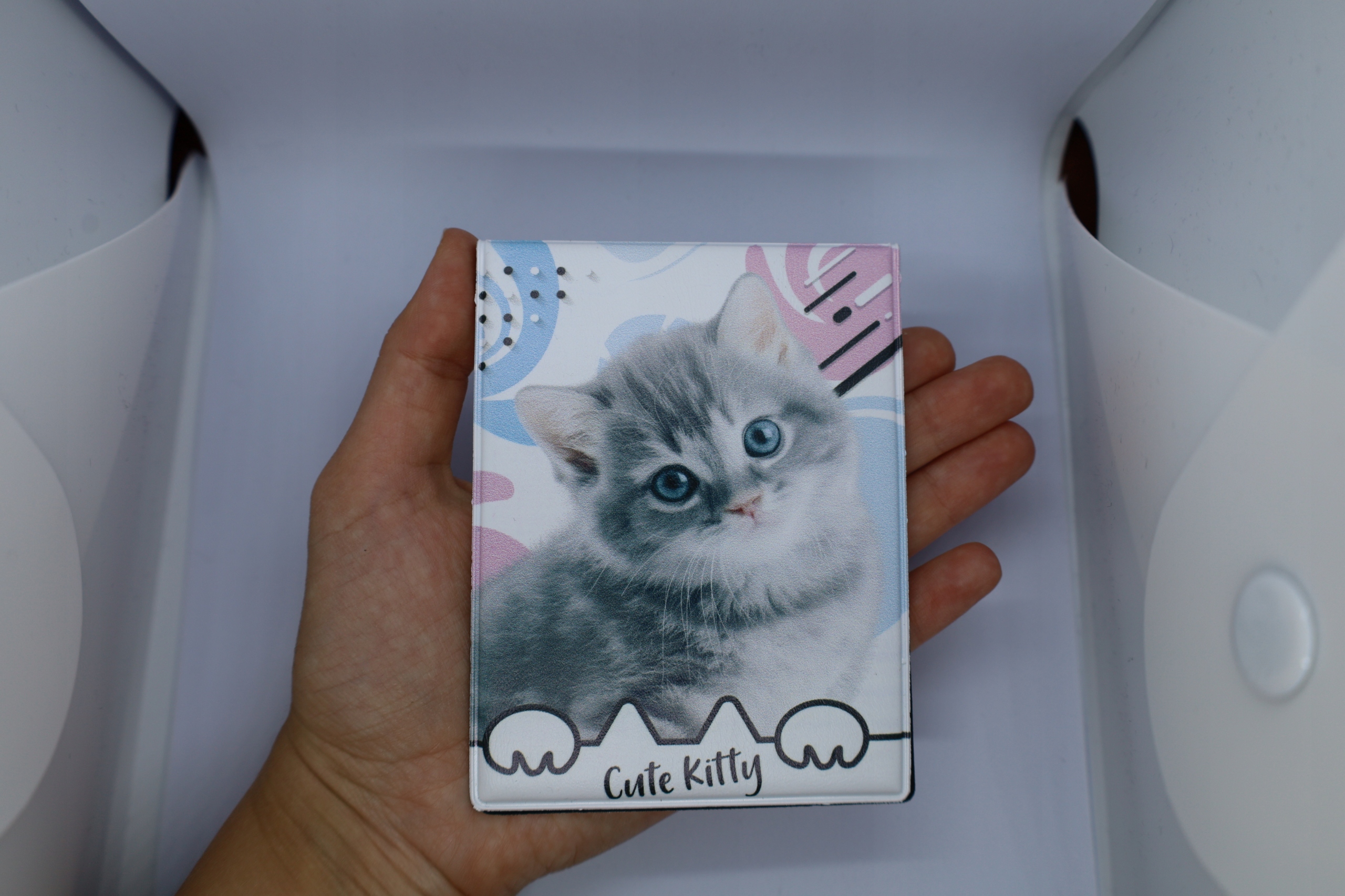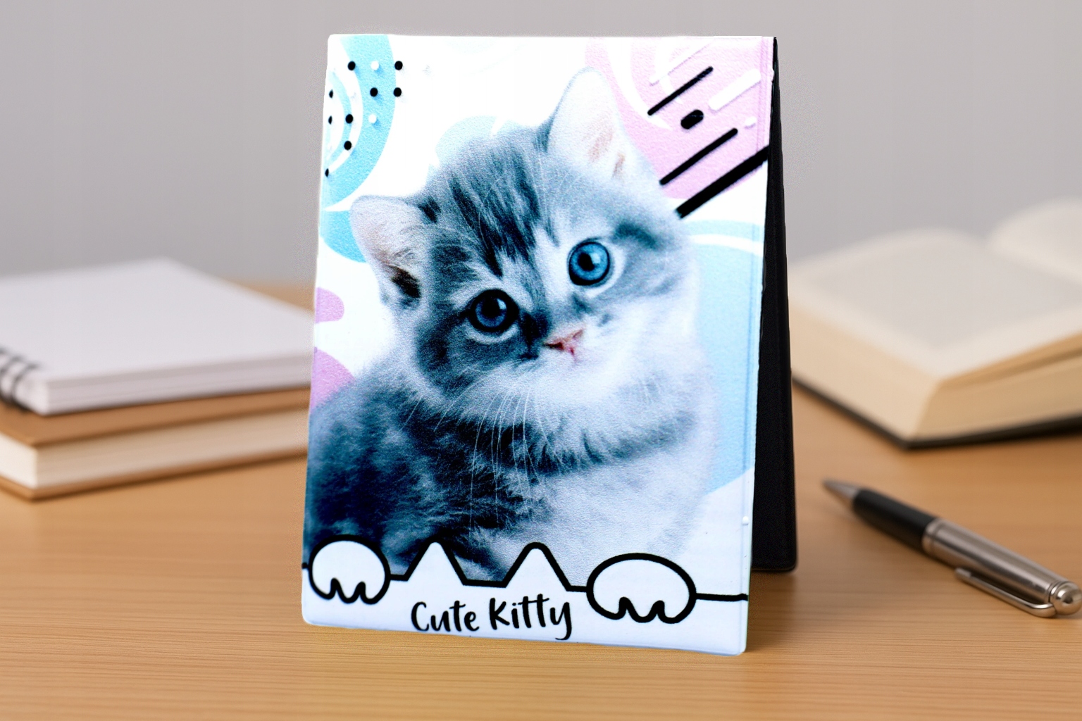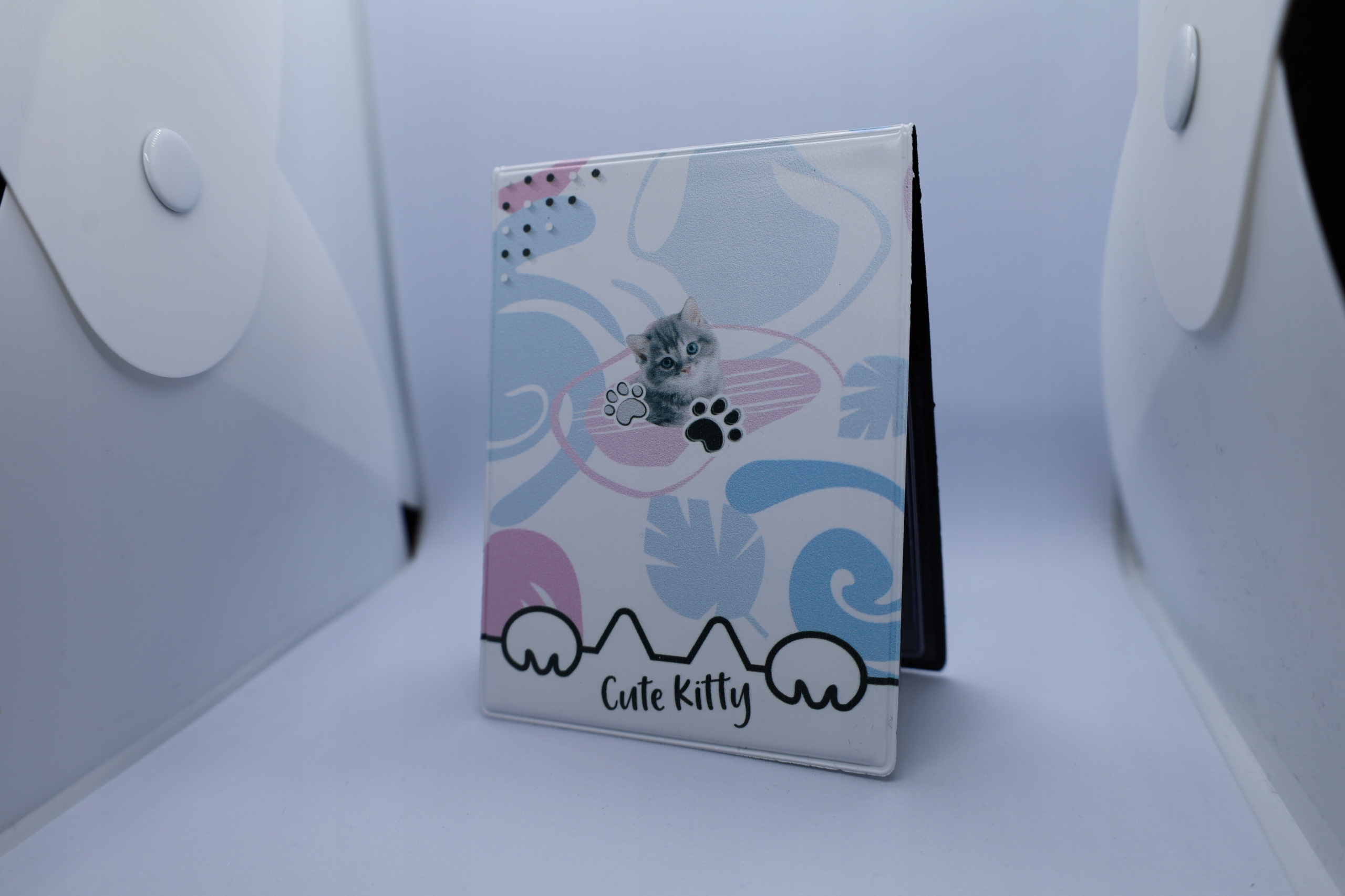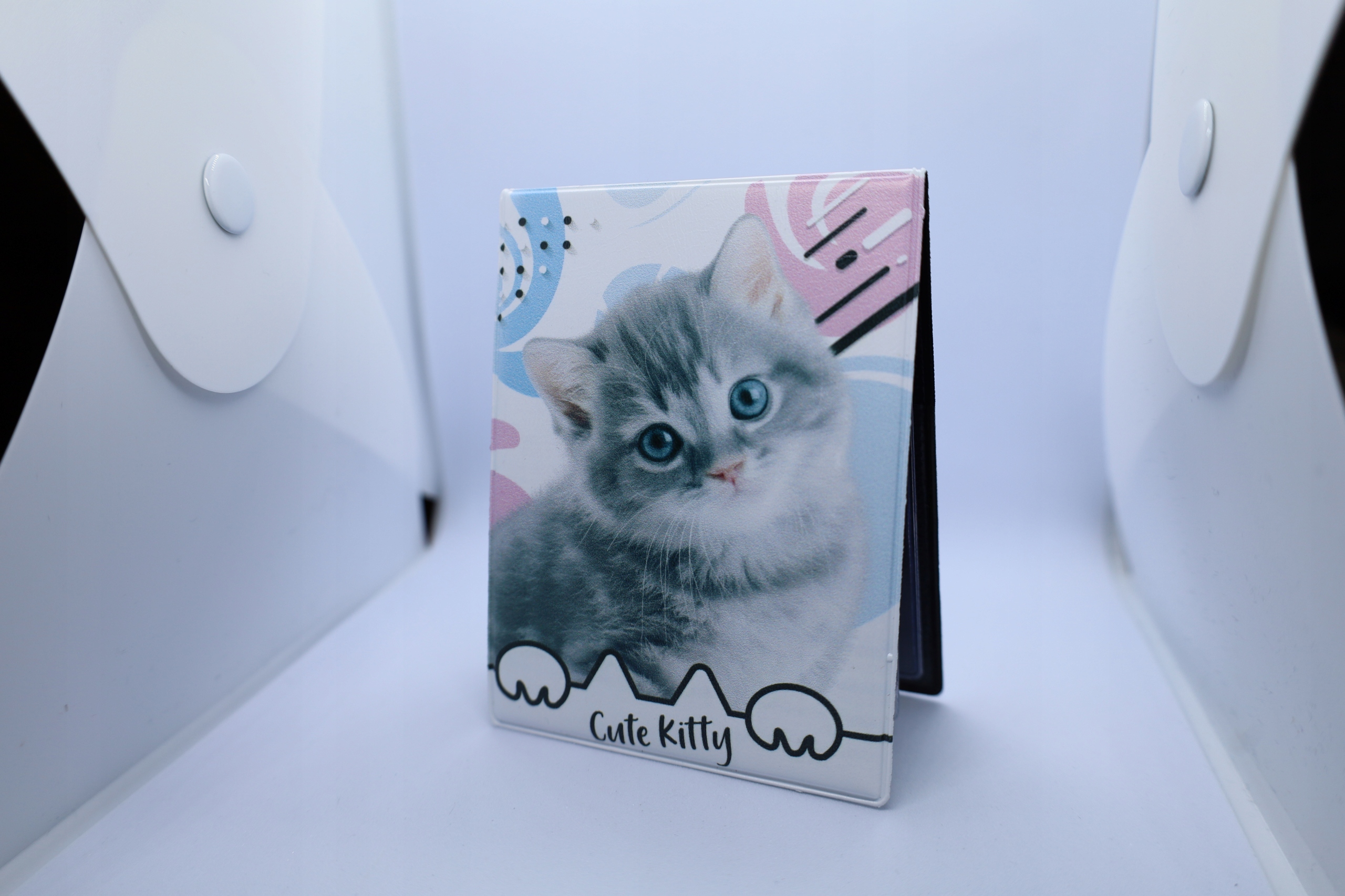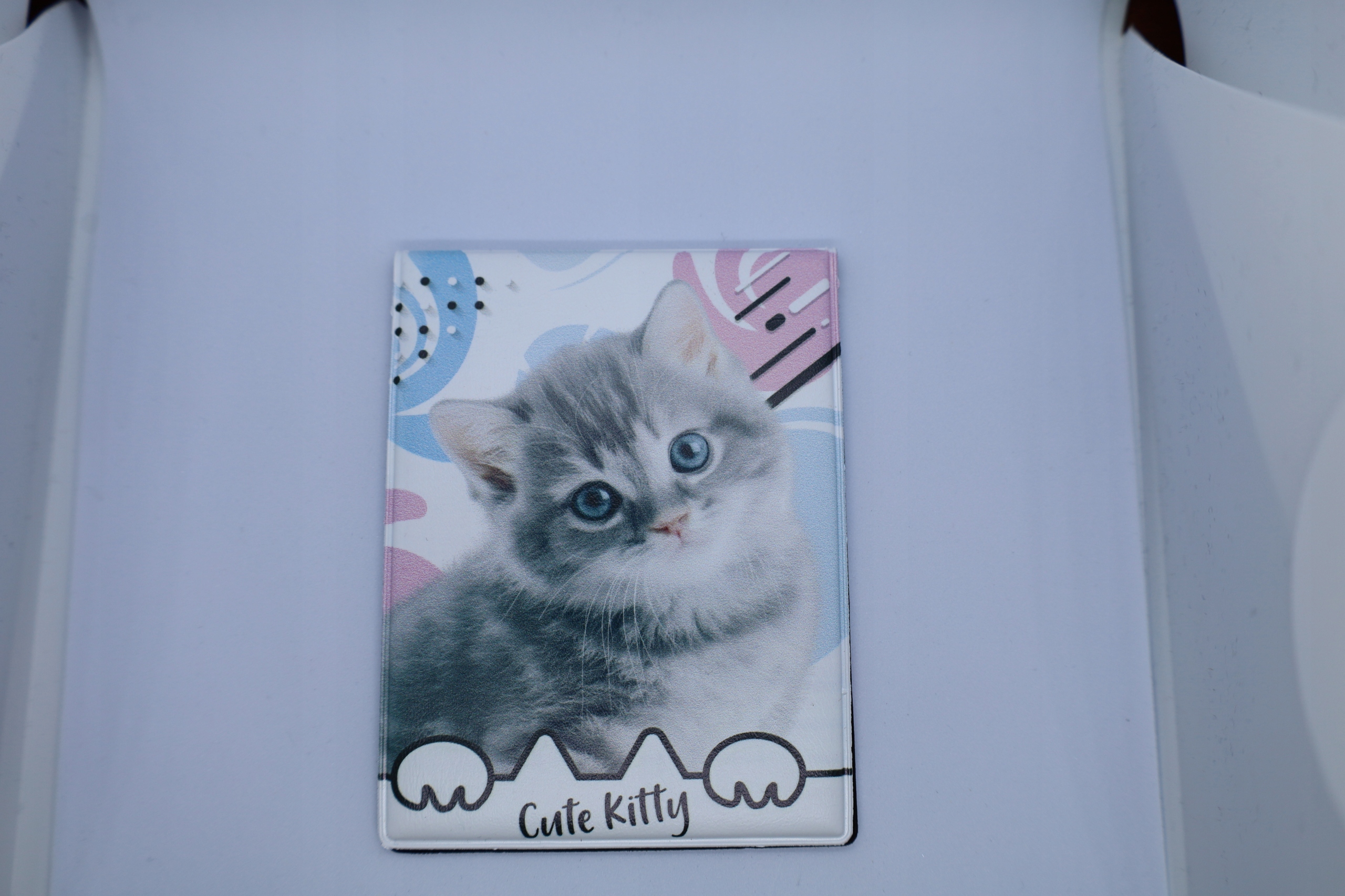 Oprawka na Legitymację szkolną z najwyższej jakości skóry ekologicznej z nadrukiem słodkiego kotka.