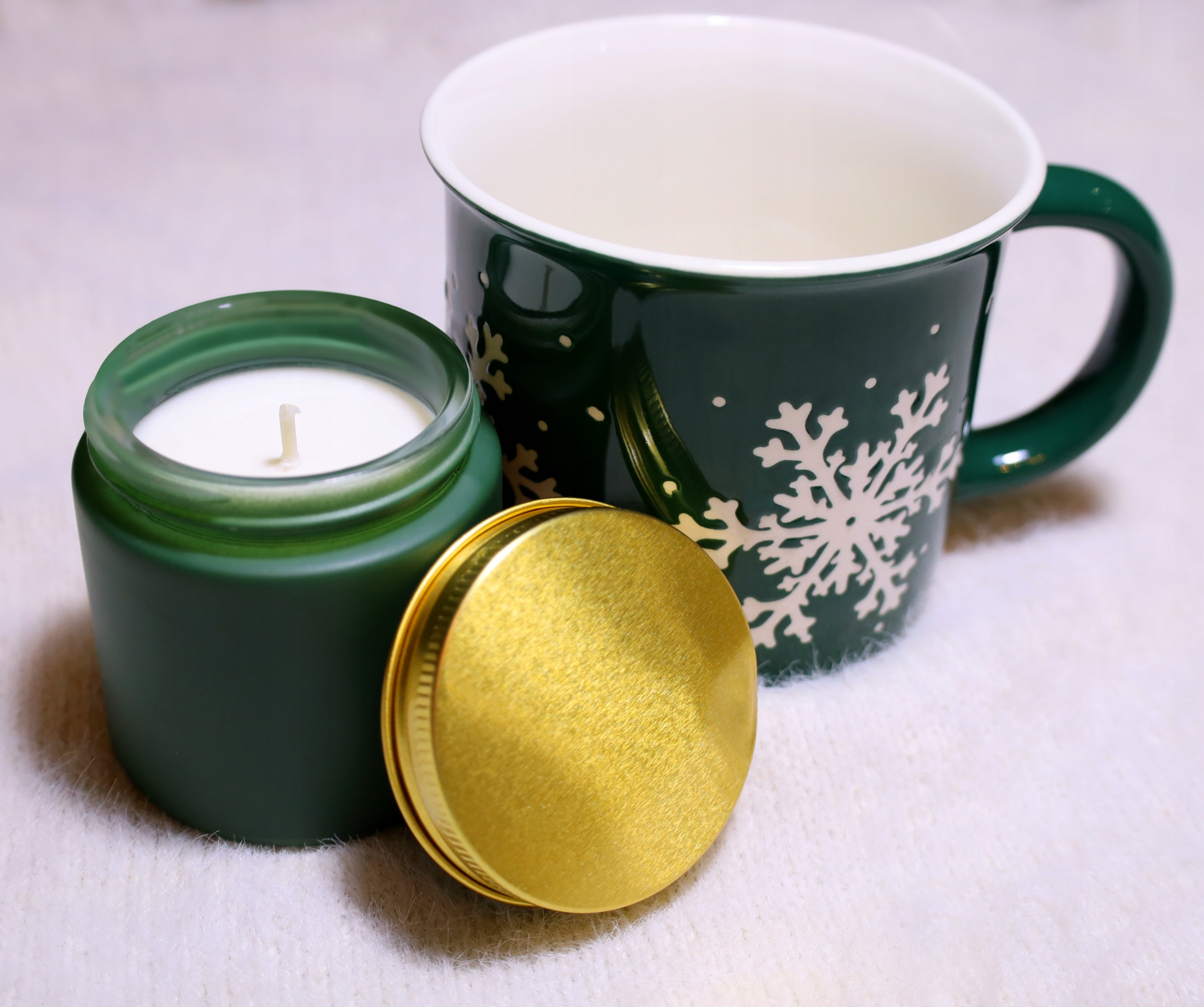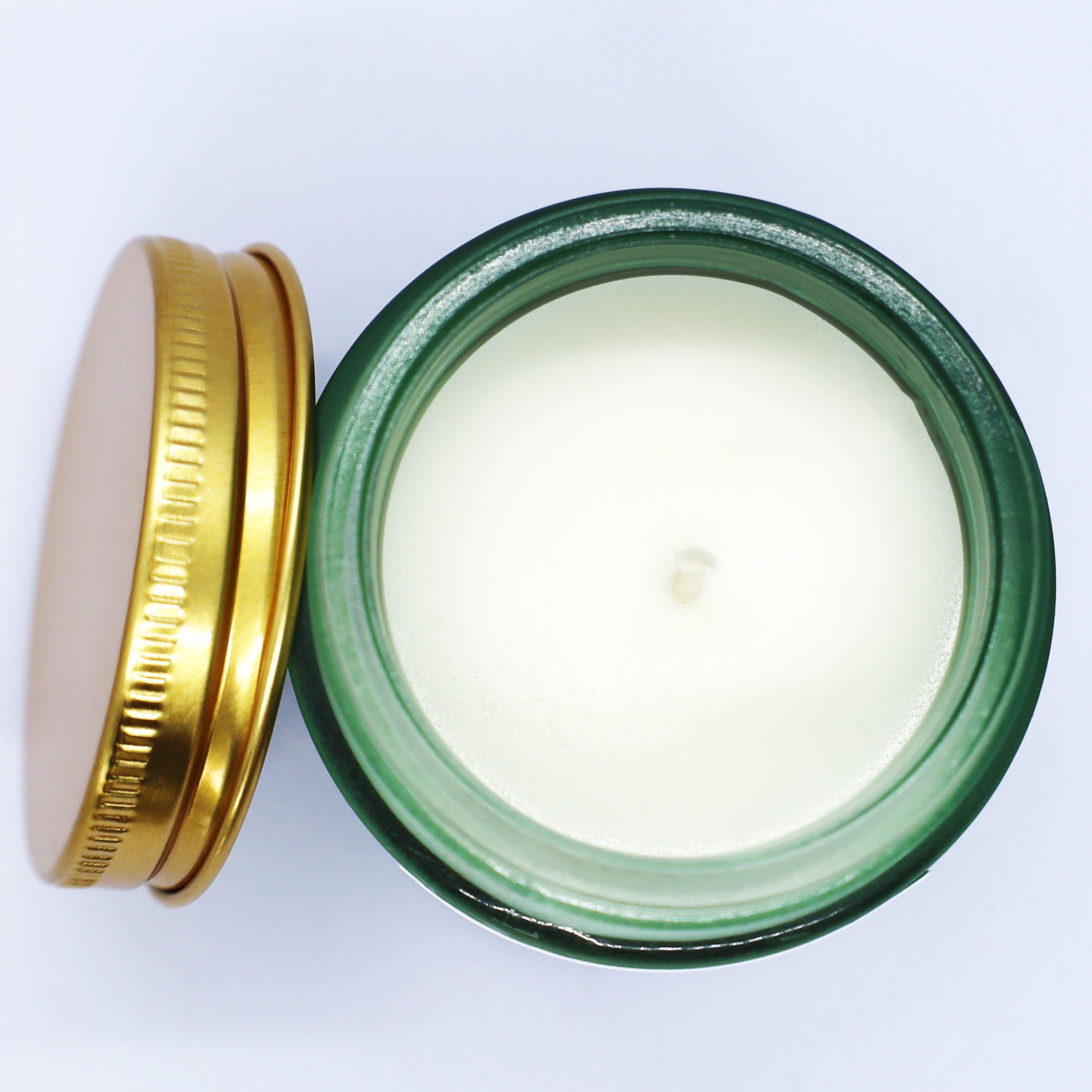 Świeca jest zamknięta w szklanym pojemniku z metalową nakrętką, który został zaprojektowany w gustownym kolorze zielonym i złotym.